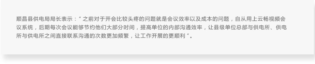 1.單位之前采取現場會議,每個供電所需要到總部現場參與會議,造成開會的效果不高。每個鄉鎮離縣城的距離比較遠的需要幾個小時,造成開會的效率非常低。