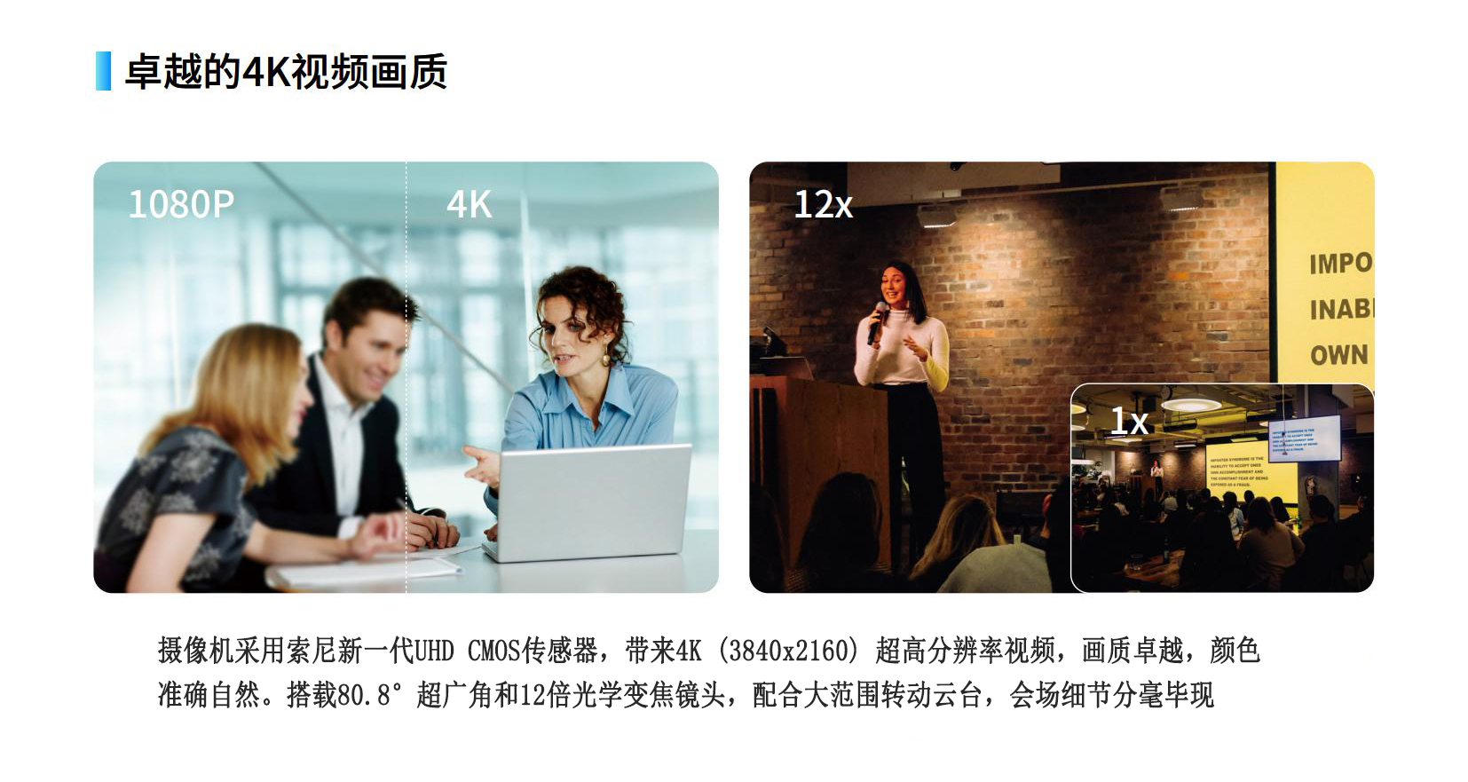 4K超高清視頻會議攝像機 全功能USB接口 4K超高清畫質 80.8°廣角鏡頭+12x光學變焦